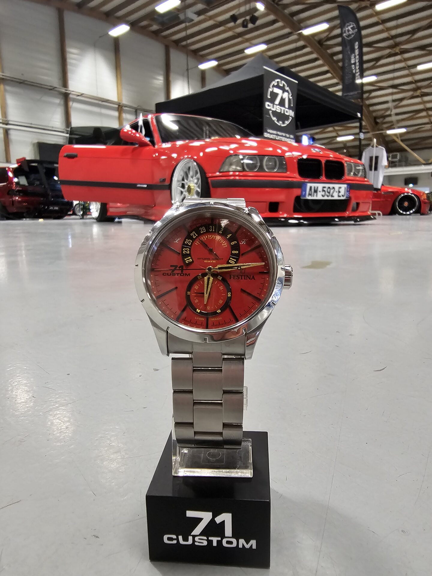 Cette montre Festina a été pensée comme un hommage à la voiture de Bruno, mais aussi à sa vie personnelle. Chaque élément, bien que subtil, porte une signification.