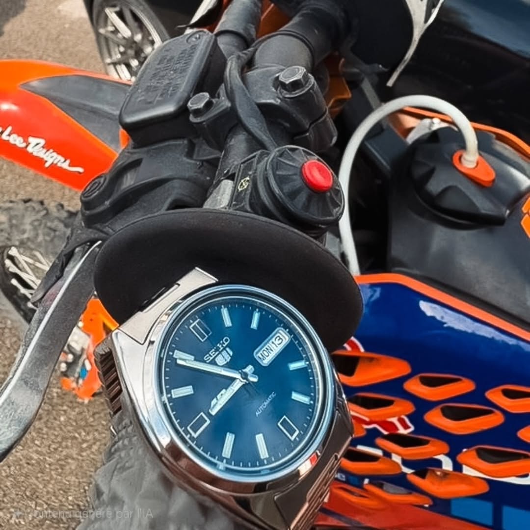 Laurent a choisi d’offrir une montre spéciale à son fils, et la Seiko 5 SNXS77K, une montre automatique d’exception, s’est révélée être une base parfaite pour ce projet. Avec son cadran bleu captivant, cette pièce a été personnalisée pour refléter à la fois leur passion commune pour la moto et des symboles chargés de sens.